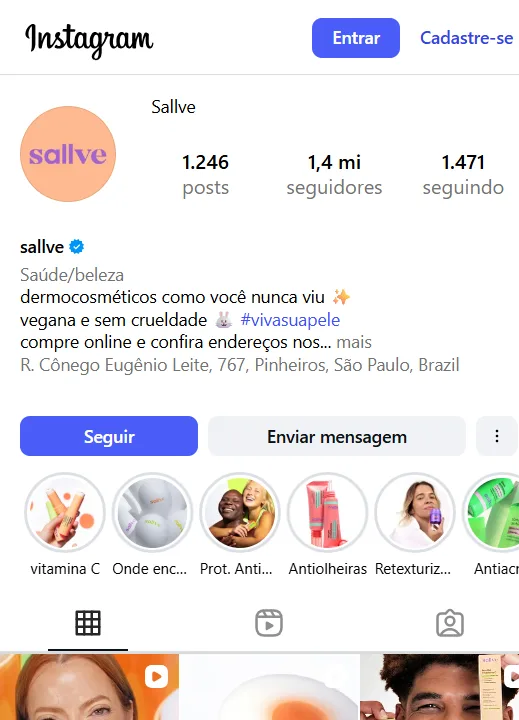 A Sallve usa a bio como ponto de organização da venda, não como espaço criativo. O visitante entende rapidamente o que a marca vende e para onde será direcionado ao clicar no link.