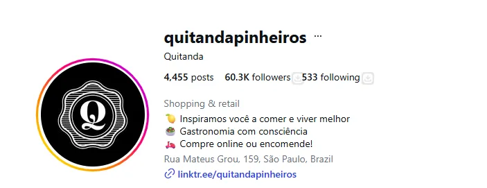 No caso da Quitanda Pinheiros, a bio cumpre um papel clássico de “etiqueta de produto”: identifica rapidamente o tipo de produto e direciona para compra ou descoberta.