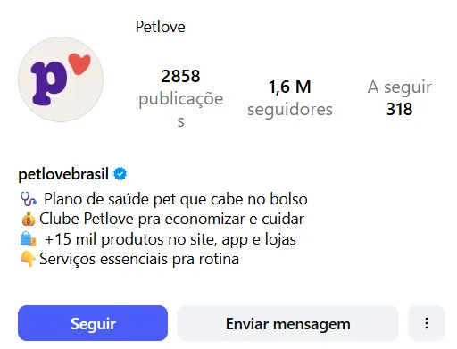A Petlove mostra bem como a bio pode organizar a entrada em perfis com grande mix de produtos. O texto não tenta cobrir tudo, mas orienta o visitante rapidamente.