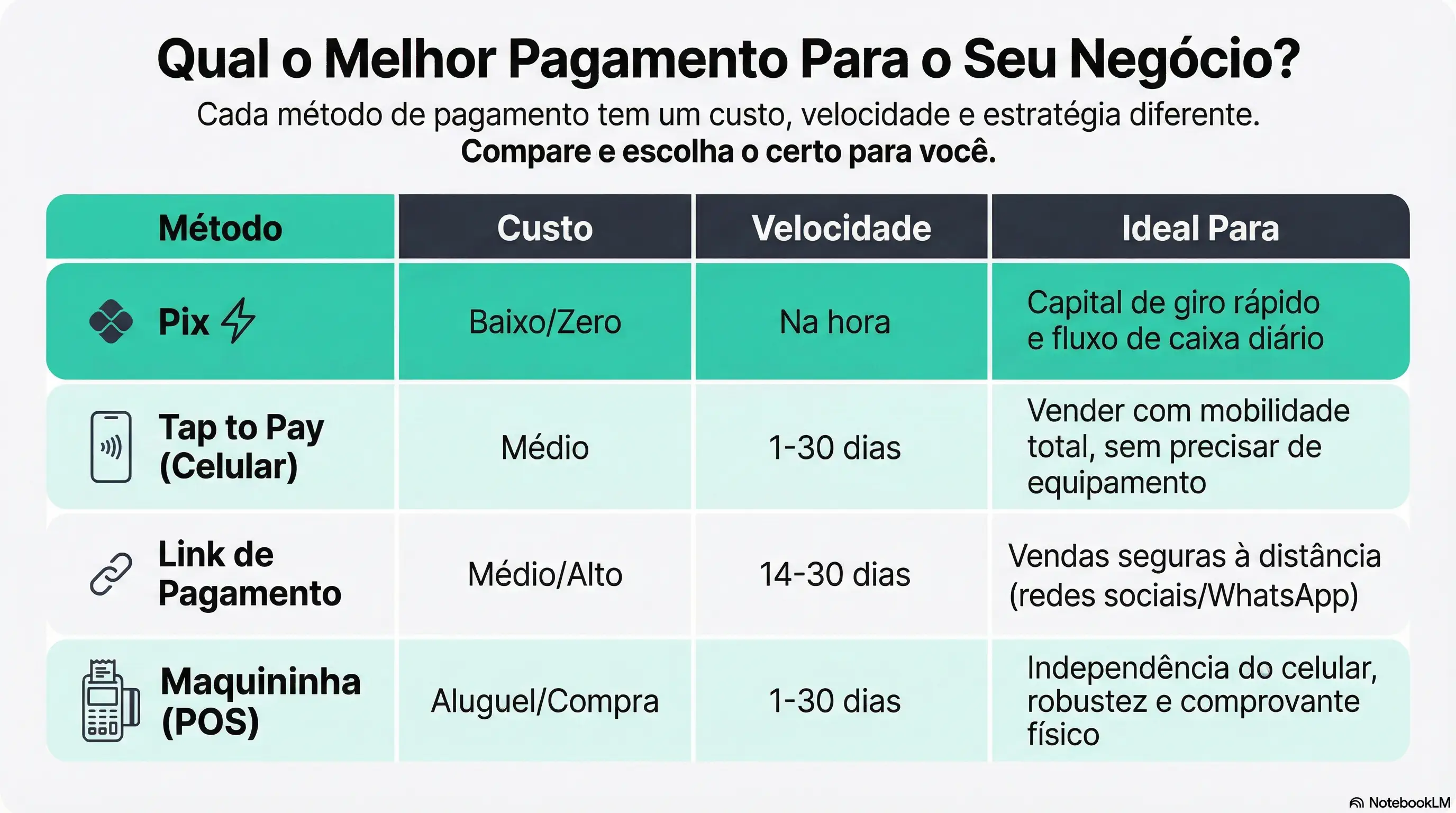 Não existe um método que atenda a todas as suas necessidades. Existe o melhor para a necessidade do seu caixa naquele momento. Veja o comparativo estratégico: